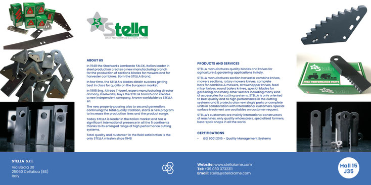 Stella производит в Италии различные режущие системы для сельскохозяйственных машин. Продукция реализуется для сборки новых машин, для поставок качественных комплектующих и комплектующих ОЕМ.